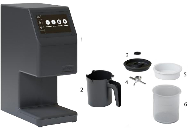 В комплекте синтетический защитный наружный стакан, защитная крышка от распыления, режущий нож, крышка для пластикового стакана и пластиковый стакан.