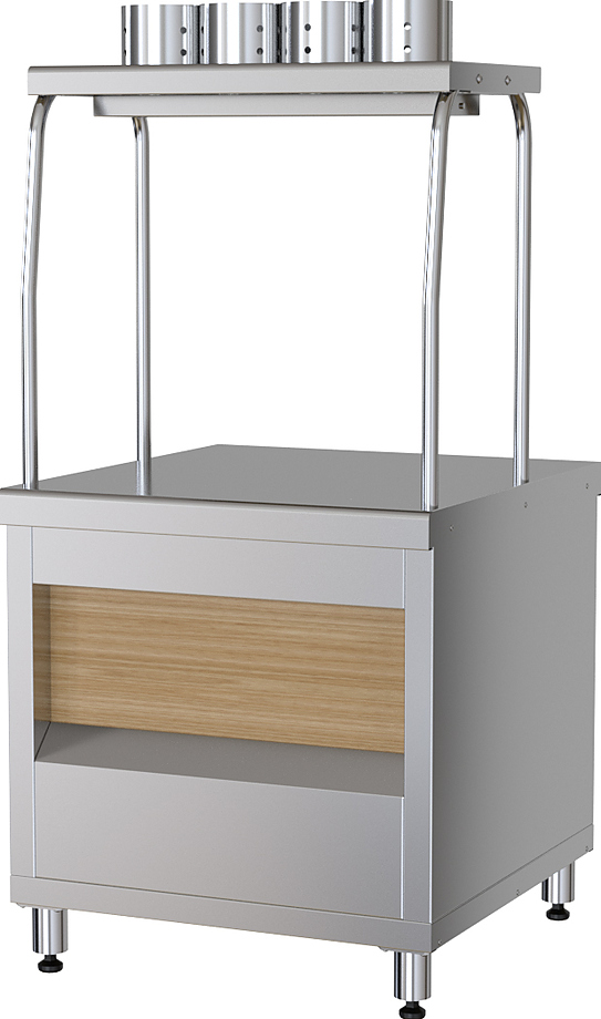 Прилавок столовых приборов Марихолодмаш ППС6 используется в составе линии раздачи ШЕФ 1500 и Шеф 1120 для демонстрационной выкладки и кратковременного хранения различных блюд, напитков, кондитерских, хлебобулочных изделий и посуды на предприятиях общественного питания, торговли и пищевых производствах. В модели предусмотрена полка для стаканов. Материал корпуса и стаканов - высококачественная нержавеющая сталь.