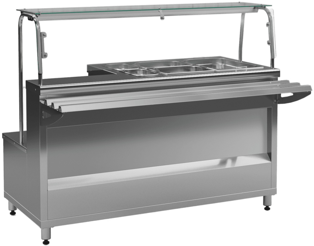 Прилавок-мармит Марихолодмаш ПМВЭ15У используется в составе линии раздачи Шеф 1500 на предприятиях общественного питания, торговли и пищевых производствах для подогрева, демонстрационной выкладки и кратковременного хранения готовых блюд, хлебобулочных и кондитерских изделий, напитков и посуды. Прилавок оснащен паровой ванной, полкой, диодной подсветкой, гастроемкостями и направляющими. Материал корпуса - высококачественная нержавеющая сталь.