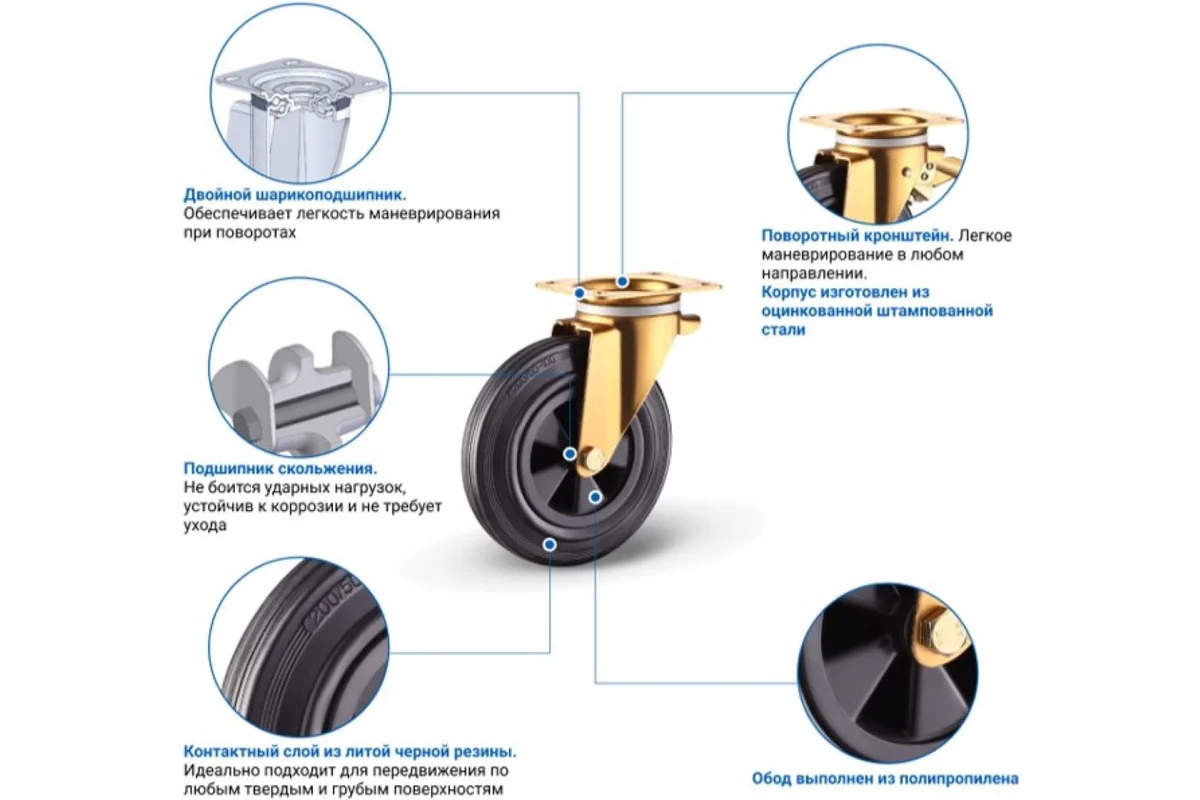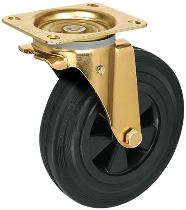 Колесо поворотное Дигрус ф160 ПКОу-Д 160 (D160) используется для установки на грузовые тележки на предприятиях общественного питания, торговли и пищевых производствах. Материал колес - резина, материал борта - прочный пластик, материал кронштейна - оцинкованная сталь.