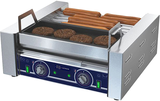 Гриль комбинированный KAYMAN КГЭ-7-Н А используется на предприятиях общественного питания, торговли и пищевых производствах для обжарки и поддержки в горячем состоянии сосисок и котлет. Модель оснащена двумя рабочими зонами и регуляторами температуры. Гриль обеспечивает равномерную температуру нагрева по всей длине жарочной поверхности. Материал поверхности - сталь.